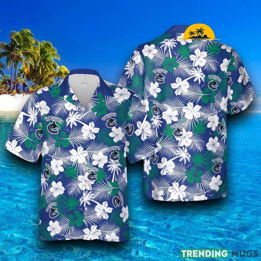 Made from high-quality materials, this Hawaiian-style shirt features the iconic Vancouver Canucks logo prominently displayed on the front and back of the shirt. The vibrant blue and green colors of the logo are perfectly complemented by the white background of the shirt, making it a standout piece in any crowd.