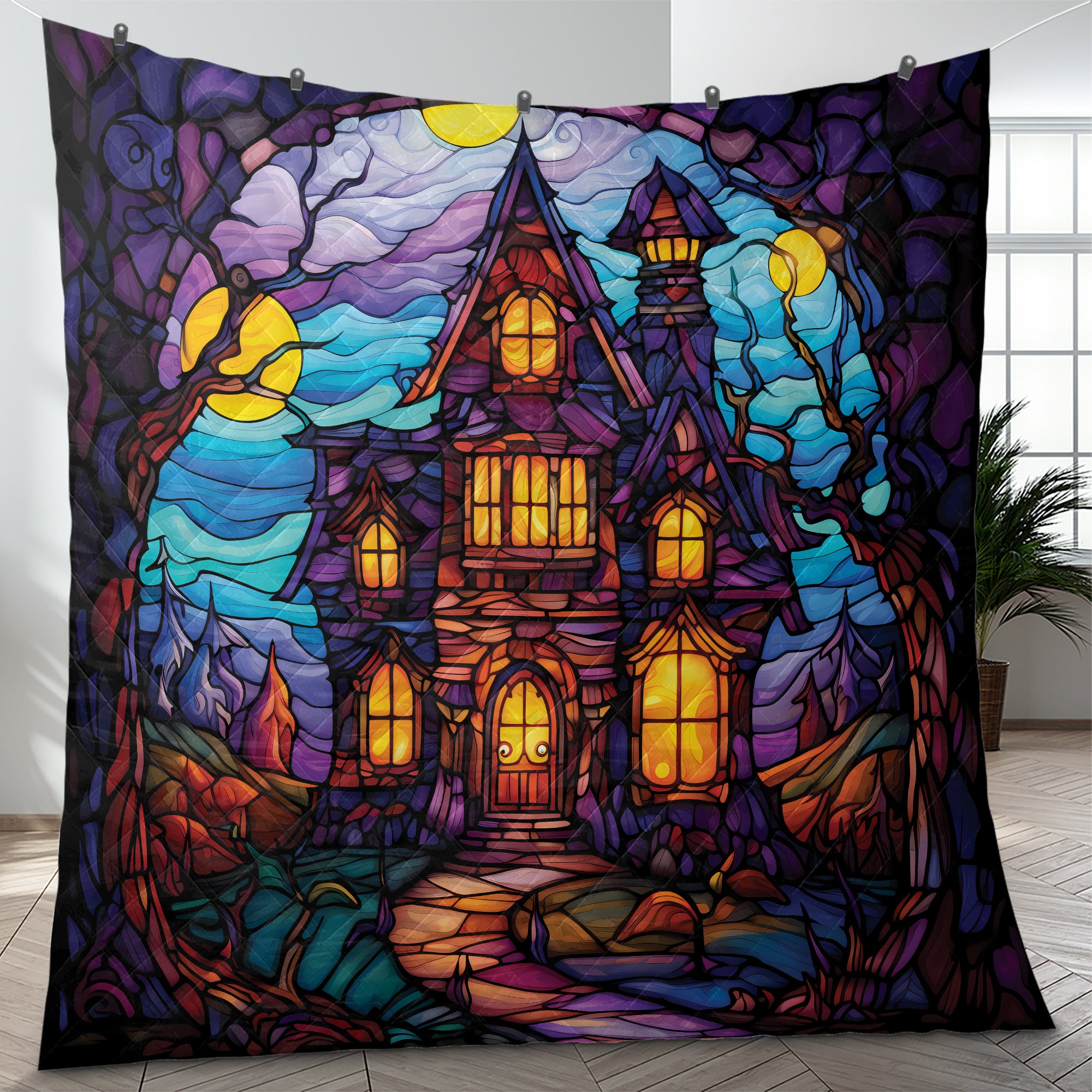 Get ready to transform your bedroom into a hauntingly stylish haven with our Vintage Retro Haunted House Halloween Quilt Bedding Set. Perfectly capturing the essence of the spooky season, this retro-inspired quilt blanket will add a touch of eerie charm to your space.