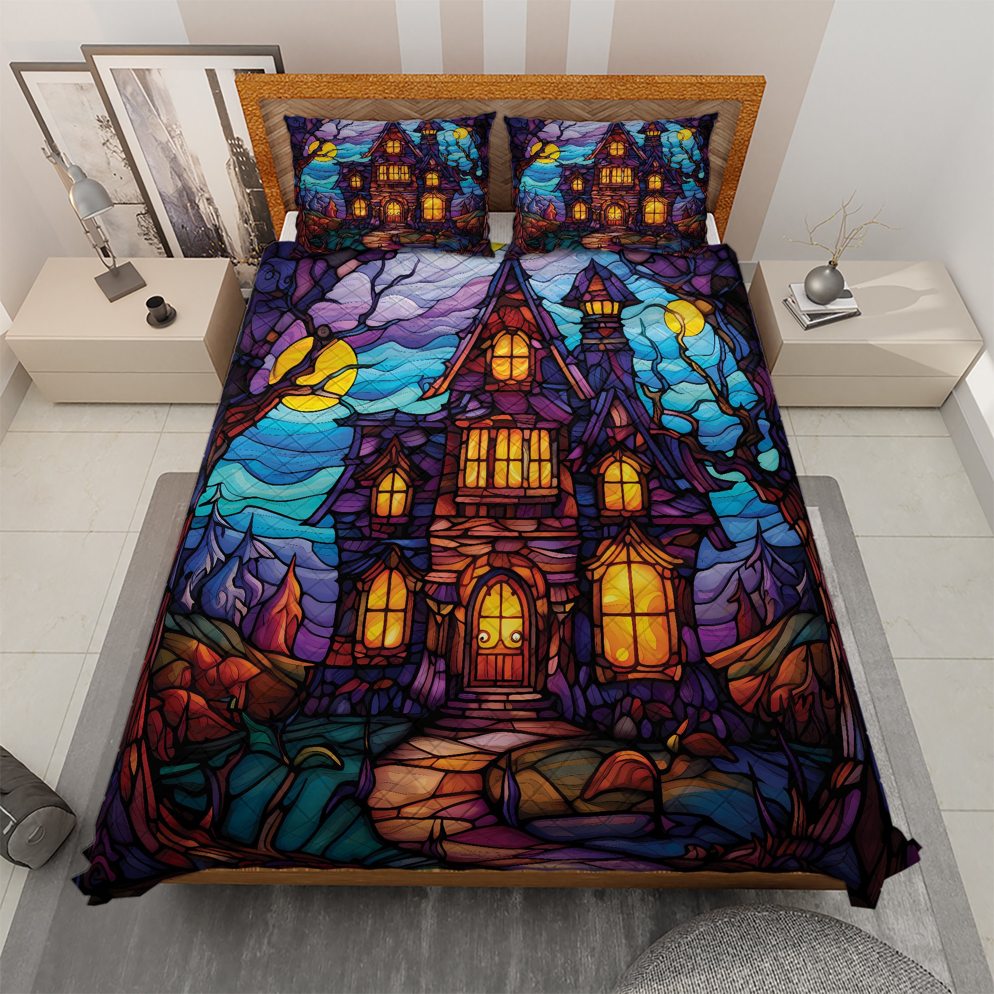 In addition to being a treat for yourself, our Vintage Retro Haunted House Halloween Quilt Bedding Set also makes a fantastic Halloween gift for your loved ones. Surprise them with a truly one-of-a-kind present that showcases your thoughtfulness and appreciation for the spookiest time of the year.