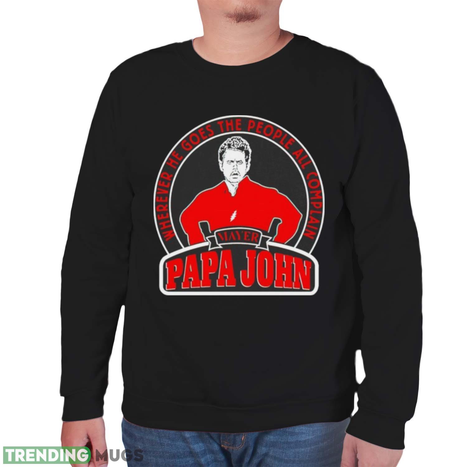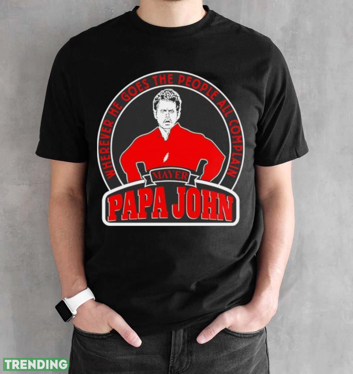 The bold, attention-grabbing design is sure to spark conversations wherever you go. Emblazoned with the witty phrase “Wherever He Goes The People All Complain Papa John,” this shirt is a playful nod to those who love a good laugh. Whether you’re a fan of Papa John himself or simply appreciate a clever play on words, this shirt is bound to bring smiles to everyone around you.