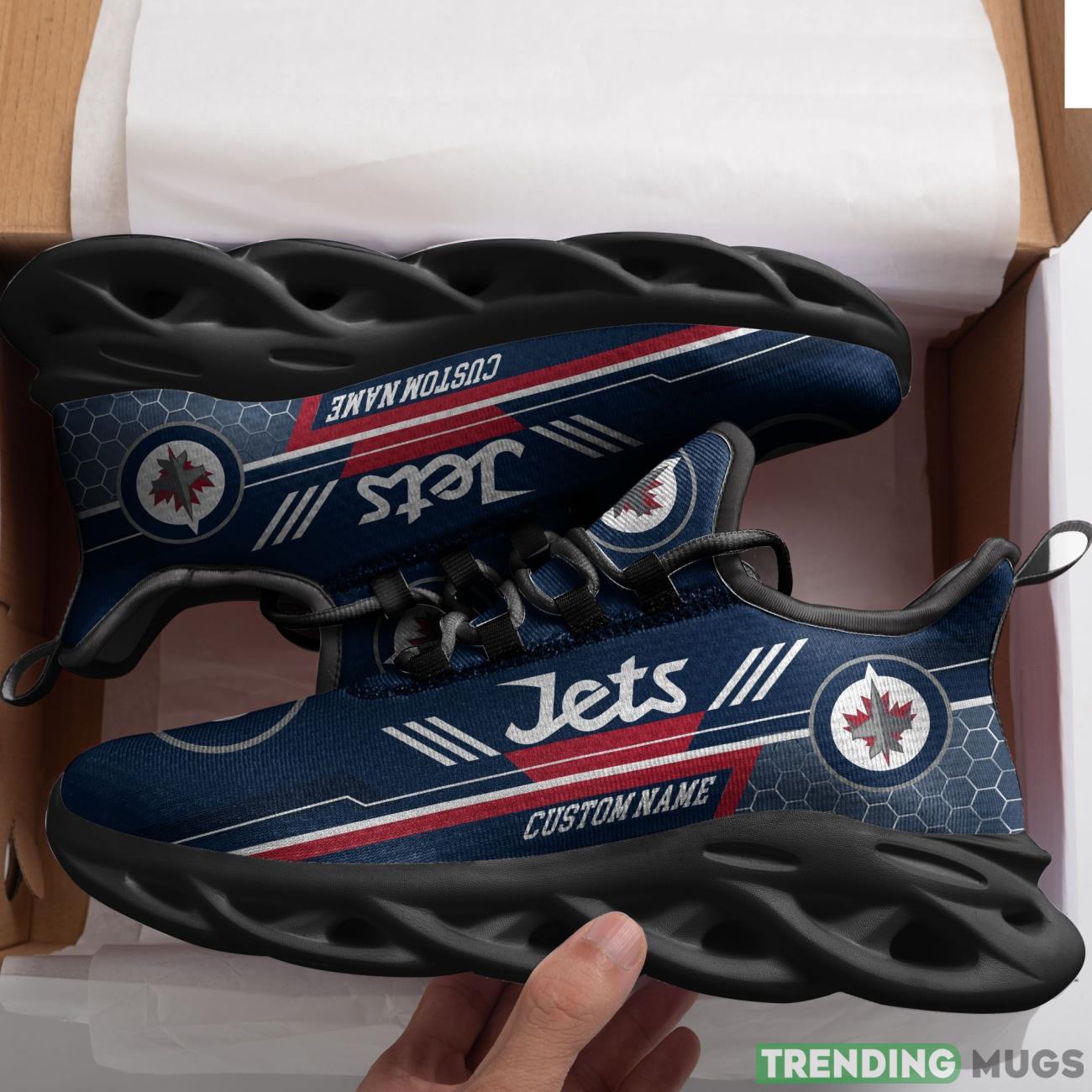 This Winnipeg Jets Custom Personalized Name Max Soul Sneakers New Trends Sport Shoes is a breathable, lightweight, and comfortable casual outdoor shoe that has a unique design. It is made of a mesh fabric which makes it sweat absorbent and breathable, while the rubber bottom ensures traction, comfort, and durability. It is available in two colors: black or white sole. There are two styles of shoelace holes so you can choose your preference.