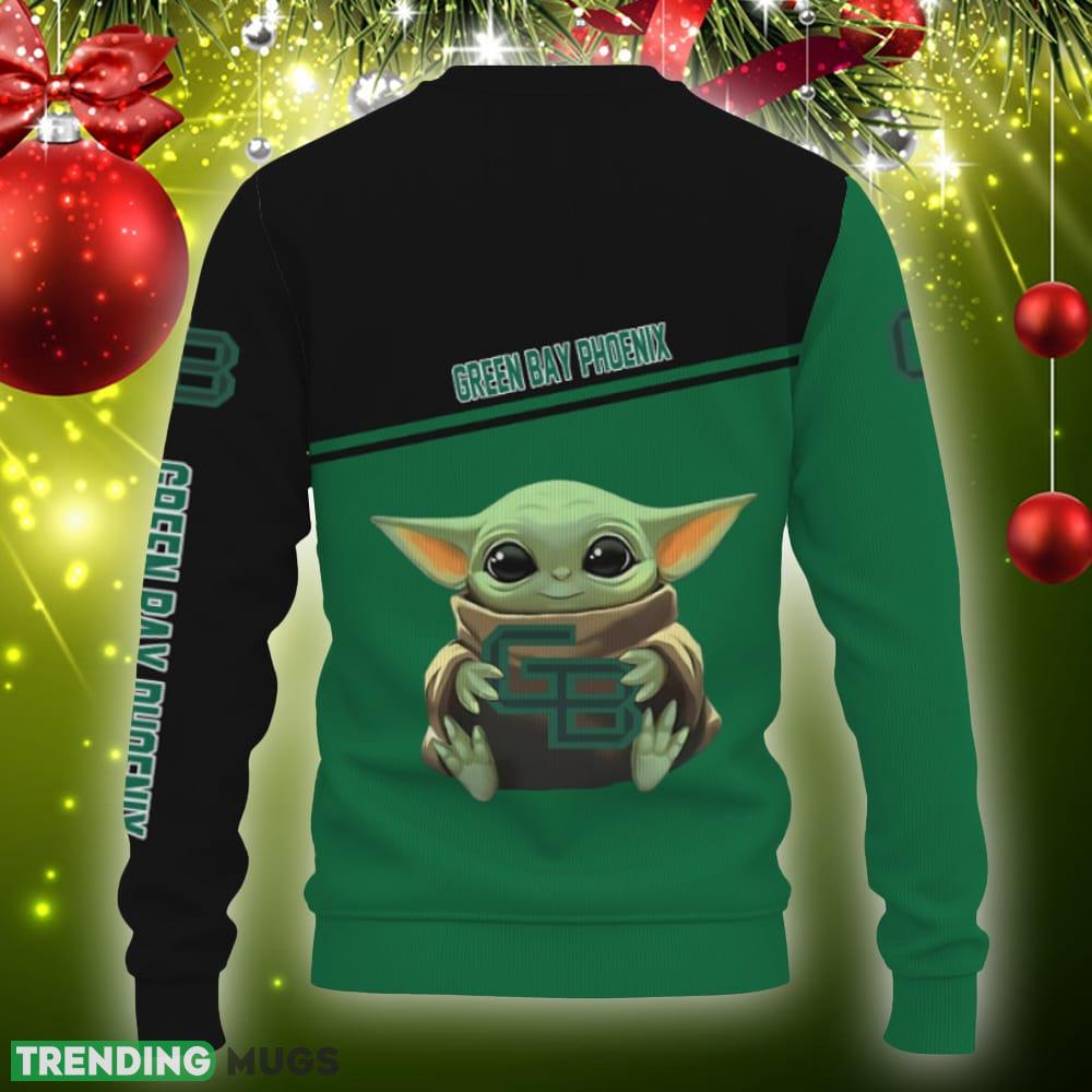 Featuring the iconic Green Bay Phoenix logo alongside an adorable Baby Yoda design, this sweater showcases your team spirit and love for the popular Star Wars character. The combination of these two beloved symbols creates a unique and eye-catching design that is sure to turn heads and spark conversations at any holiday gathering.