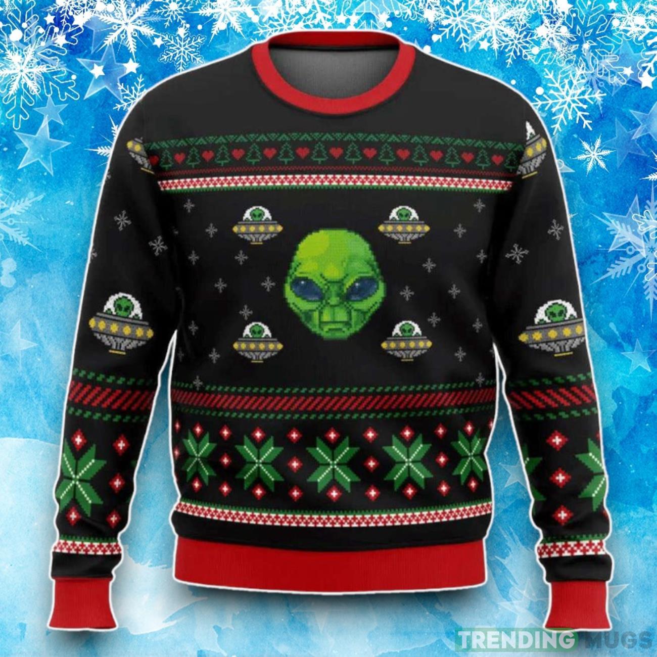 Crafted with utmost care and attention to detail, this sweater showcases an adorable alien piloting a UFO amidst a backdrop of sparkling stars. The vibrant colors and intricate design of this Christmas sweater will surely make you the center of attention at any holiday gathering.