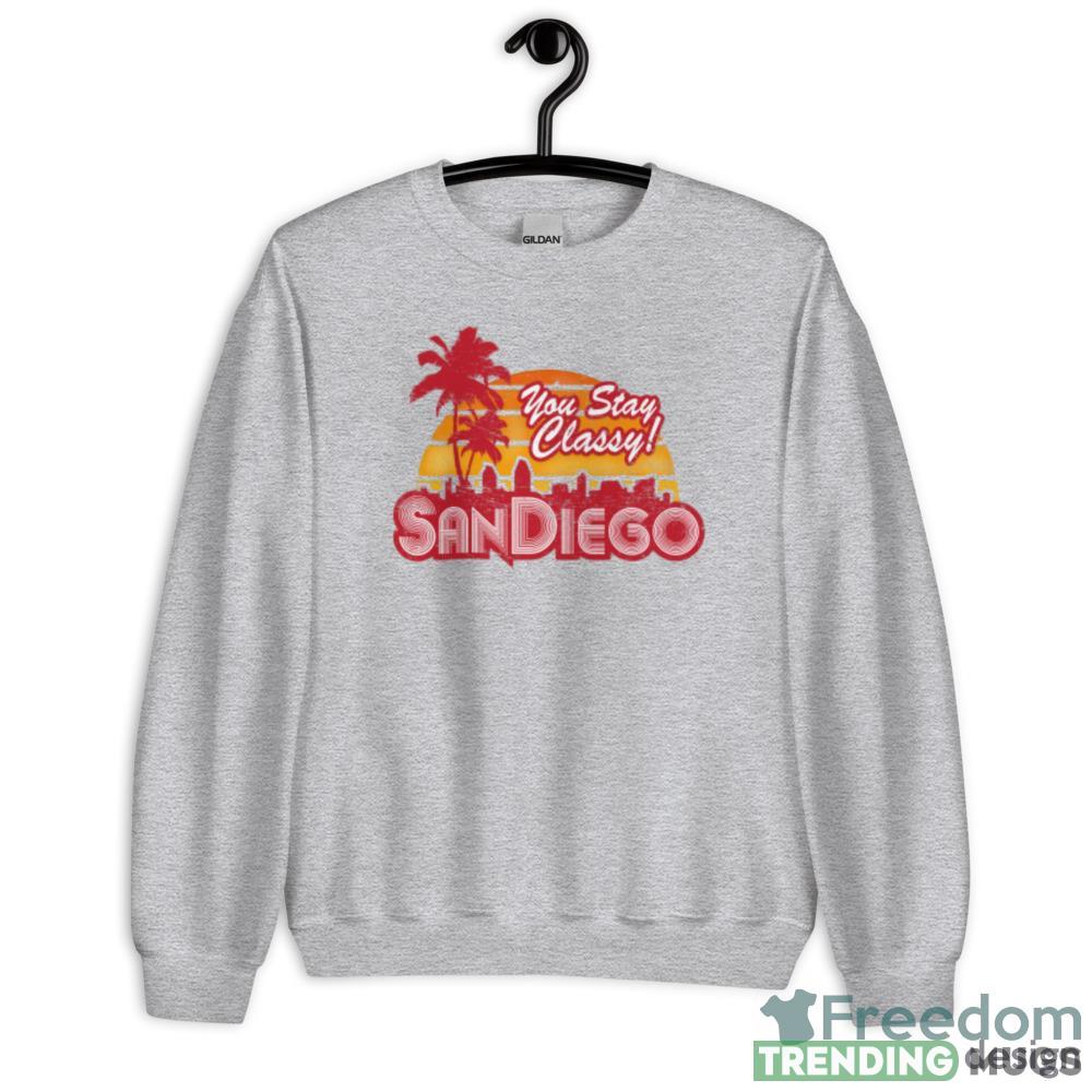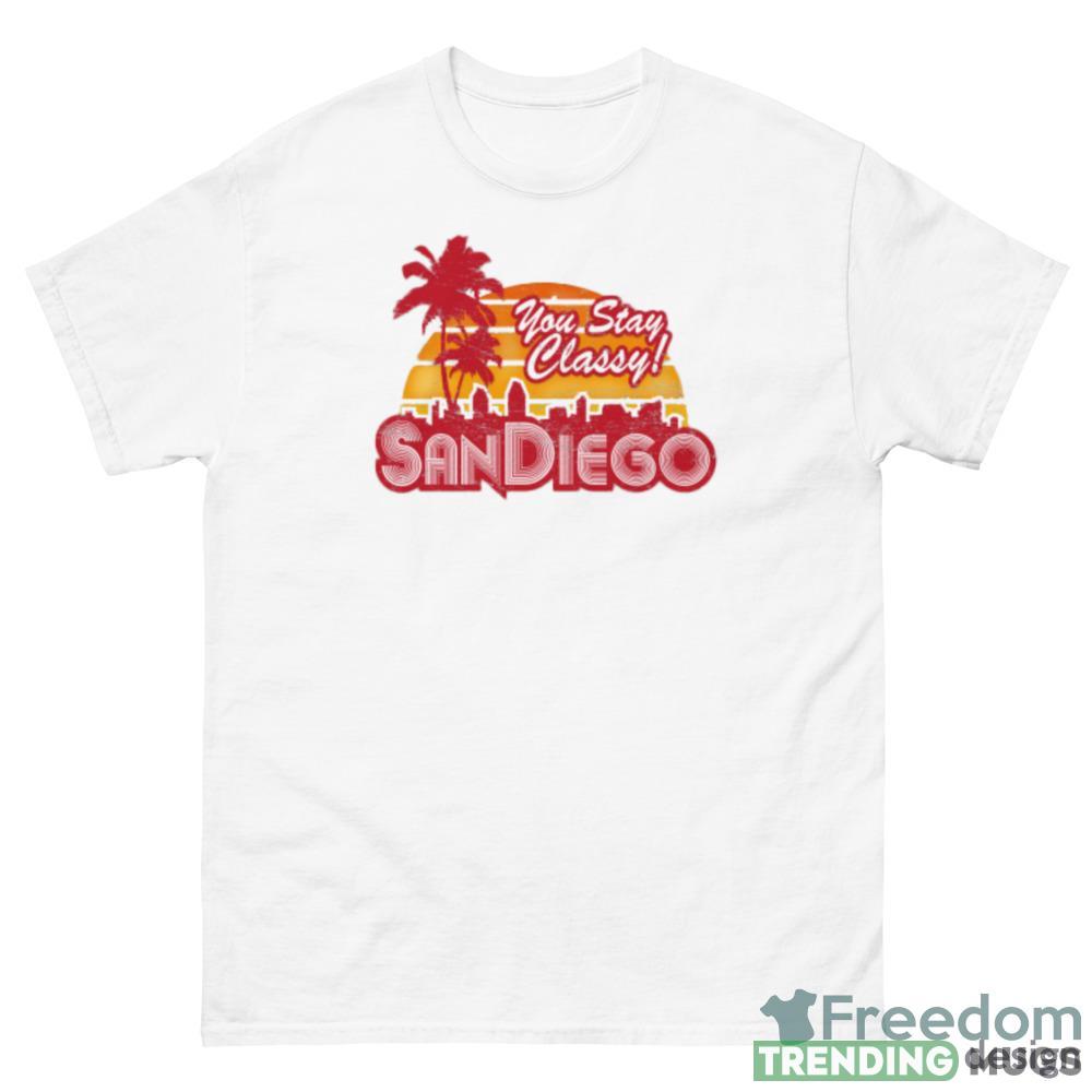 The You Stay Classy! San Diego Retro T-Shirt features a bold and eye-catching design that showcases the iconic San Diego skyline, with palm trees and the ocean in the background. The retro font and color scheme lend an authentic vintage feel to the tee, making it a must-have for anyone who loves the classic San Diego style.